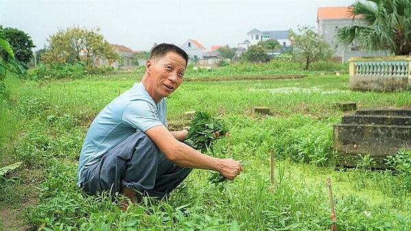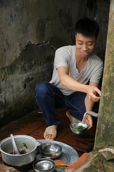 Vừa dựng xe vào đống lóng (củi vụn người ta làm rổ giá bỏ đi – PV) mới mua, anh khoe: "Mua có 120 nghìn thôi mà nấu cả năm chẳng hết", rửa vội mặt, rồi chạy nhanh ra vườn rau muống xanh non để hái vào nấu cơm. Thường ngày anh Hinh chỉ quanh quẩn làm cỏ ở ruộng, trồng cần nước nhưng mấy hôm nay cần chưa thu hoạch, rảnh việc anh lại đi trông vịt hộ em gái.