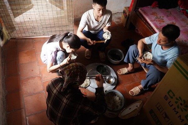 Đang kể dở, anh Hinh đã nấu xong bữa cơm có rau muống luộc, chút giò kho và nồi cơm nóng hổi. Lúc ấy cũng kịp lúc cậu con trai đầu Phạm Văn Thông đang học lớp 11 trường THPT chuyên tỉnh Hưng Yên về nhà. Bình thường Thông sẽ mang cơm lên trường ăn để nghỉ ngơi cho buổi học chiều, tối mới về vì trường cách nhà 10 km. Nhưng hôm nay em không có tiết học chiều nên tranh thủ về nhà giúp bố mẹ và học bài.
