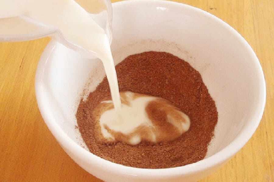 – Cho bã cà phê và sữa tươi vào bát, khuấy đều đến khi thu được hỗn hợp đồng nhất.