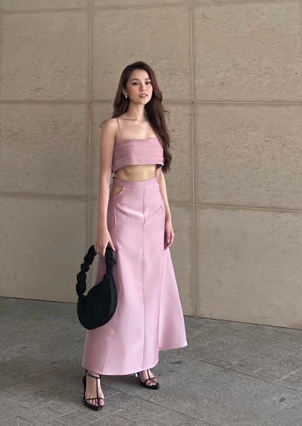 Trong một lần đi ăn tối, cô phối corset gấm mang phong cách retro, phối chân váy satin màu kem, tạo vẻ sang trọng bằng túi Louis Vuitton.