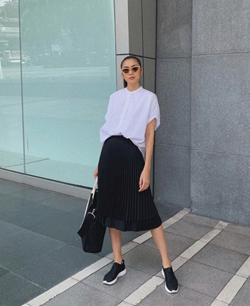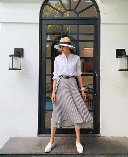 Tăng Thanh Hà cập nhật váy áo đúng trend theo từng mùa nhưng phụ kiện cô chọn luôn là mẫu giày đường nét đơn giản, màu trang nhã.