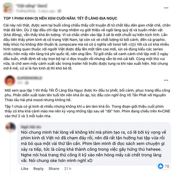 Ngay từ hai tập đầu, series K+ORIGINAL "Tết ở làng Địa Ngục" đã cuốn người xem vào câu chuyện kỳ dị và nhuốm màu tâm linh, đứng Top 1 trên K+ và một nền tảng quốc tế, đồng thời nhận được “cơn mưa” lời khen từ khán giả. Đây là phim truyền hình kinh dị cổ trang đầu tiên tại Việt Nam do K+ đầu tư sản xuất, được xem là series nổi bật nhất màn ảnh hiện tại. Khán giả sẽ được xem phim sớm nhất lúc 20h thứ 2, 3 hàng tuần trên kênh K+CINE và App K+.