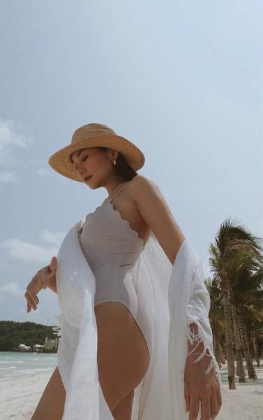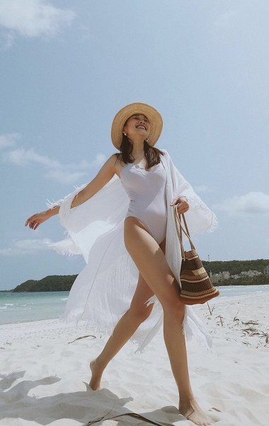 Ngoài áo tắm liền thân, những mẫu bikini tôn vẻ đẹp sexy cũng được Thanh Hằng dùng khi tham gia chụp ảnh, quay quảng cáo cho các thương hiệu nổi tiếng. Dù kiểu dáng trang phục có thay đổi, ‘chị đại’ làng mẫu vẫn dành nhiều tình cảm cho những thiết kế gam trắng nhẹ nhàng.