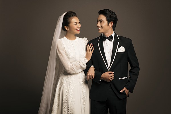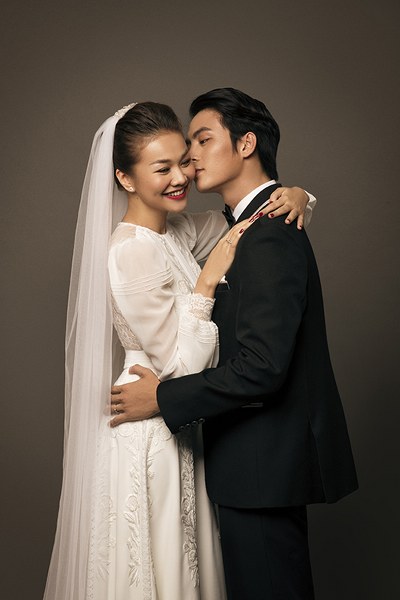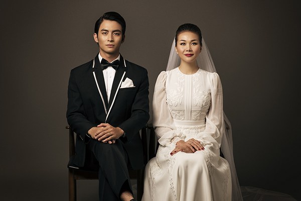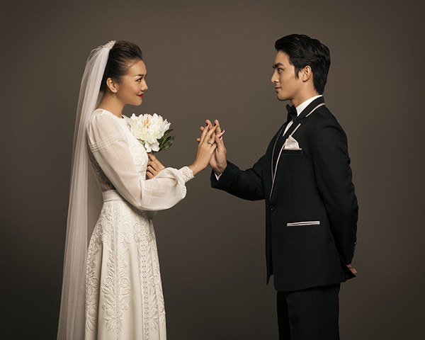 Bộ váy cưới của Thanh Hằng trong phim \"Chị chị em em\" mang phong cách cổ điển nhờ kiểu tay áo phồng, phom dáng chữ A nhưng được biến tấu mới lạ với chất liệu đa dạng, hoa văn dạng sọc.