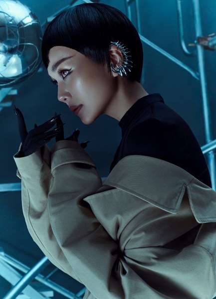 Cô dùng phụ kiện là khuyên vành tai hình xương sống.