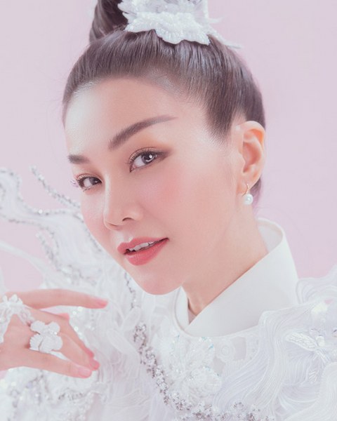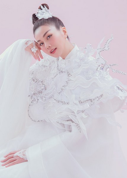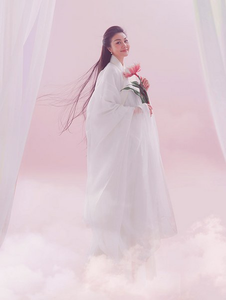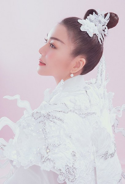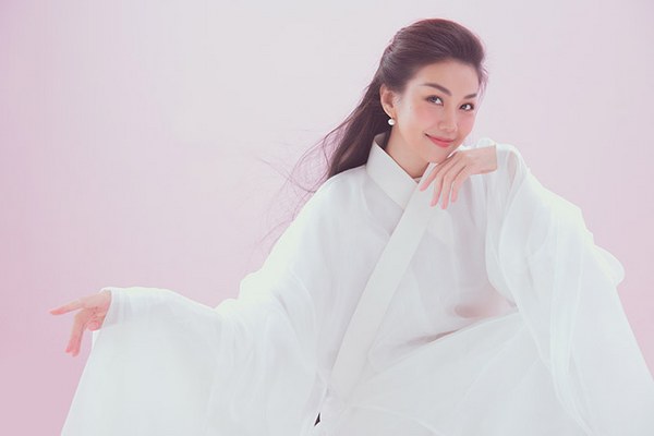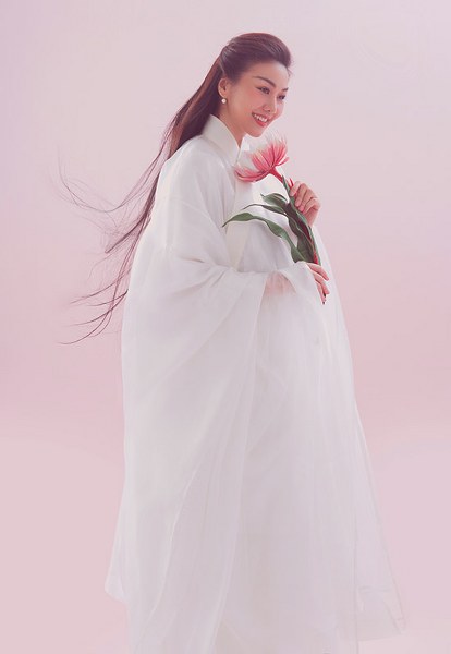 Siêu mẫu Thanh Hằng trông khác lạ khi mặc trang phục kiểu xưa may bằng chất liệu lụa, voan tơ của NTK Thuỷ Nguyễn.