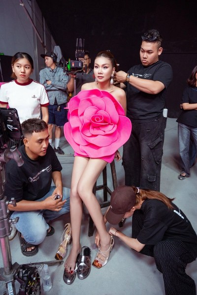 Thanh Hằng được trợ lý hỗ trợ mặc trang phục, trang điểm, làm tóc để ghi hình cho chương trình Vietnam's Next Top Model 2025.