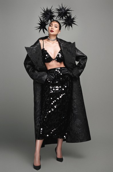 Thanh Hằng diện chân váy sequin kết hợp bra top đồng điệu. Cô khoác thêm áo choàng dài vải gấm, với điểm nhấn là phần ve áo to bản. Để tăng vẻ ấn tượng, cô sử dụng trang sức tóc là chiếc bờm tạo hình từ lông vũ.