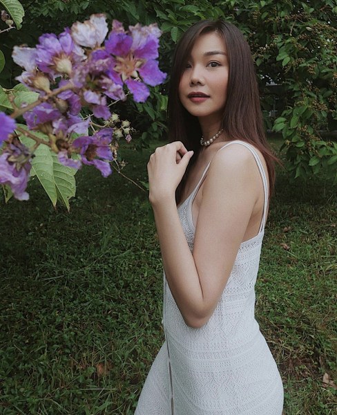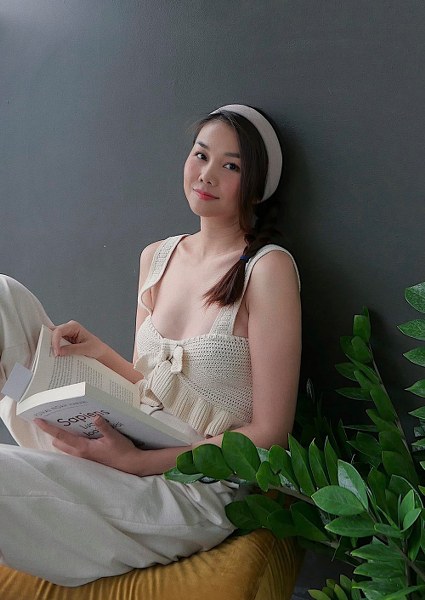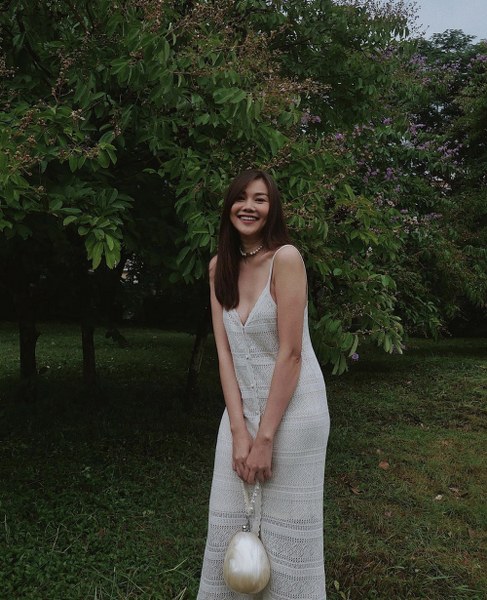 Diện áo hai dây với phần cúp ngực đẹp mắt, Thanh Hằng chọn thêm vòng cổ ngọc trai để tạo điểm nhấn cho tổng thể.