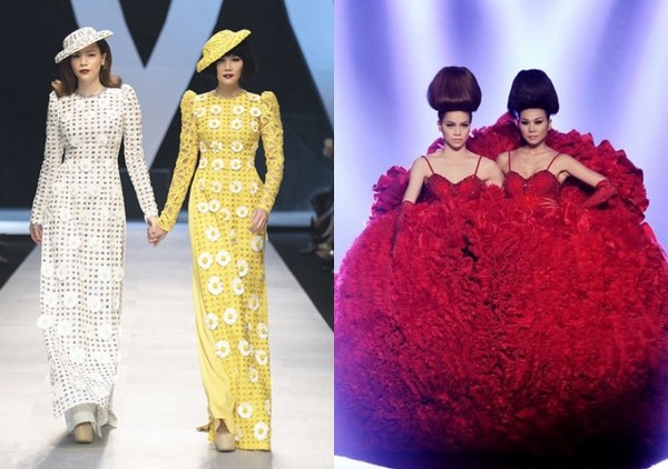 Hai người đẹp đồng điệu trên sàn runway. Trong ảnh, Thanh Hằng, Hồ Ngọc Hà sải bước thể hiện bộ sưu tập "Nấm" (phải) và "Coco yêu dấu", lần lượt các năm 2013, 2018, đều do Công Trí thực hiện.