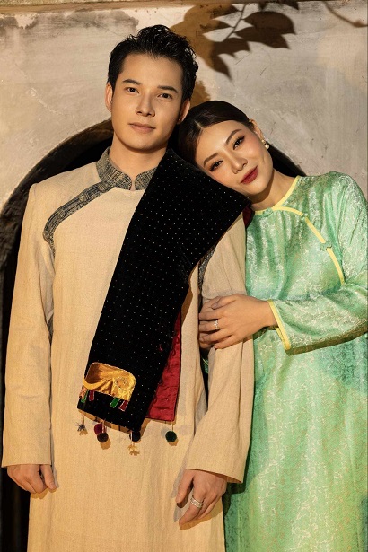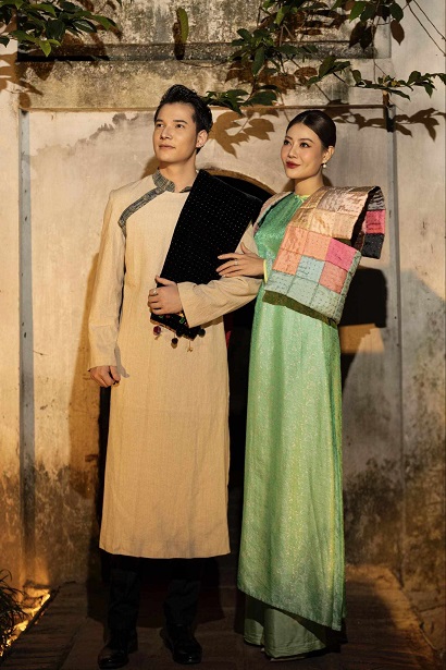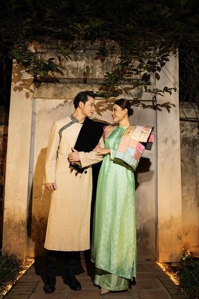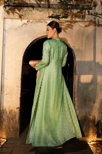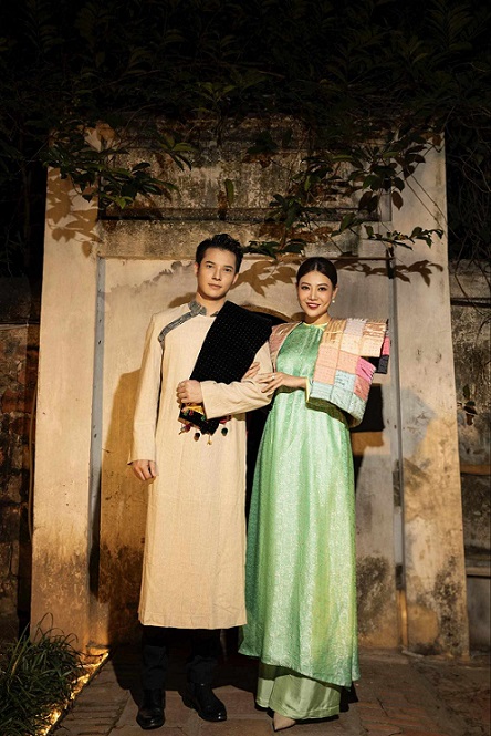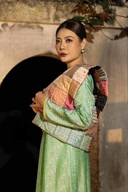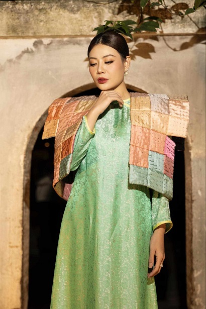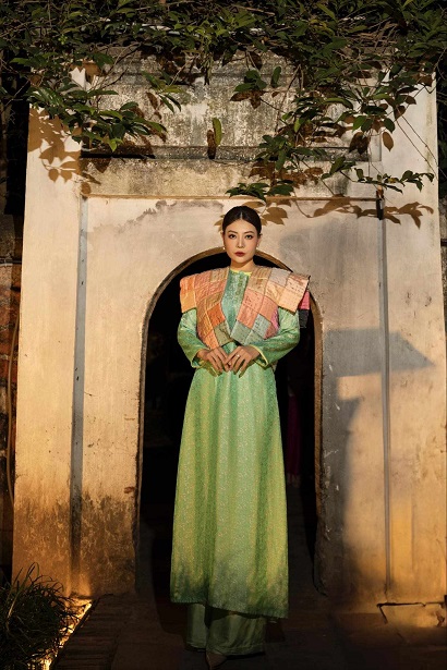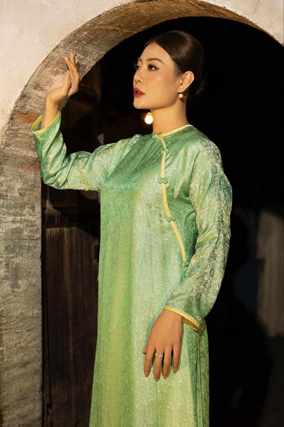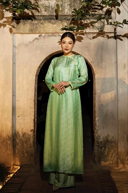 Cô diện áo dài màu xanh của NTK Trịnh Bích Thủy, tóc bùi gọn phía sau thể hiện vẻ đẹp nữ tính của người con gái Việt.
