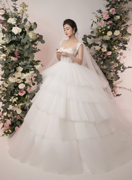 Dáng váy xòe phồng được làm mới khi xếp tầng, lớp, tạo nên bộ cánh hiện đại, trẻ trung.