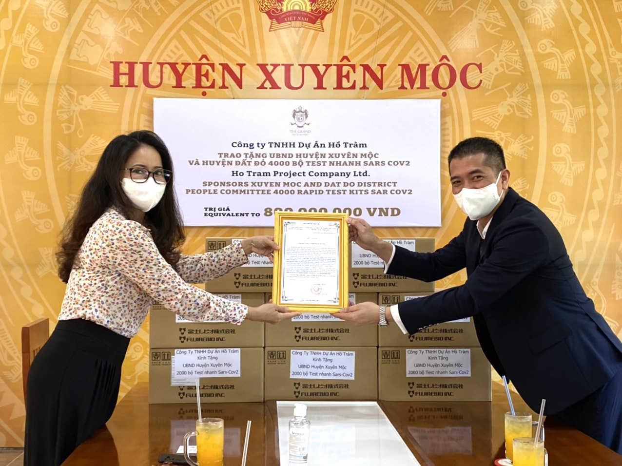 4000 bộ test được ông Kyle Pham, Giám đốc Tài chính của The Grand Ho Tram Strip trao cho bà Lê Thị Trang Đài, Chủ tịch UBND huyện Xuyên Mộc.