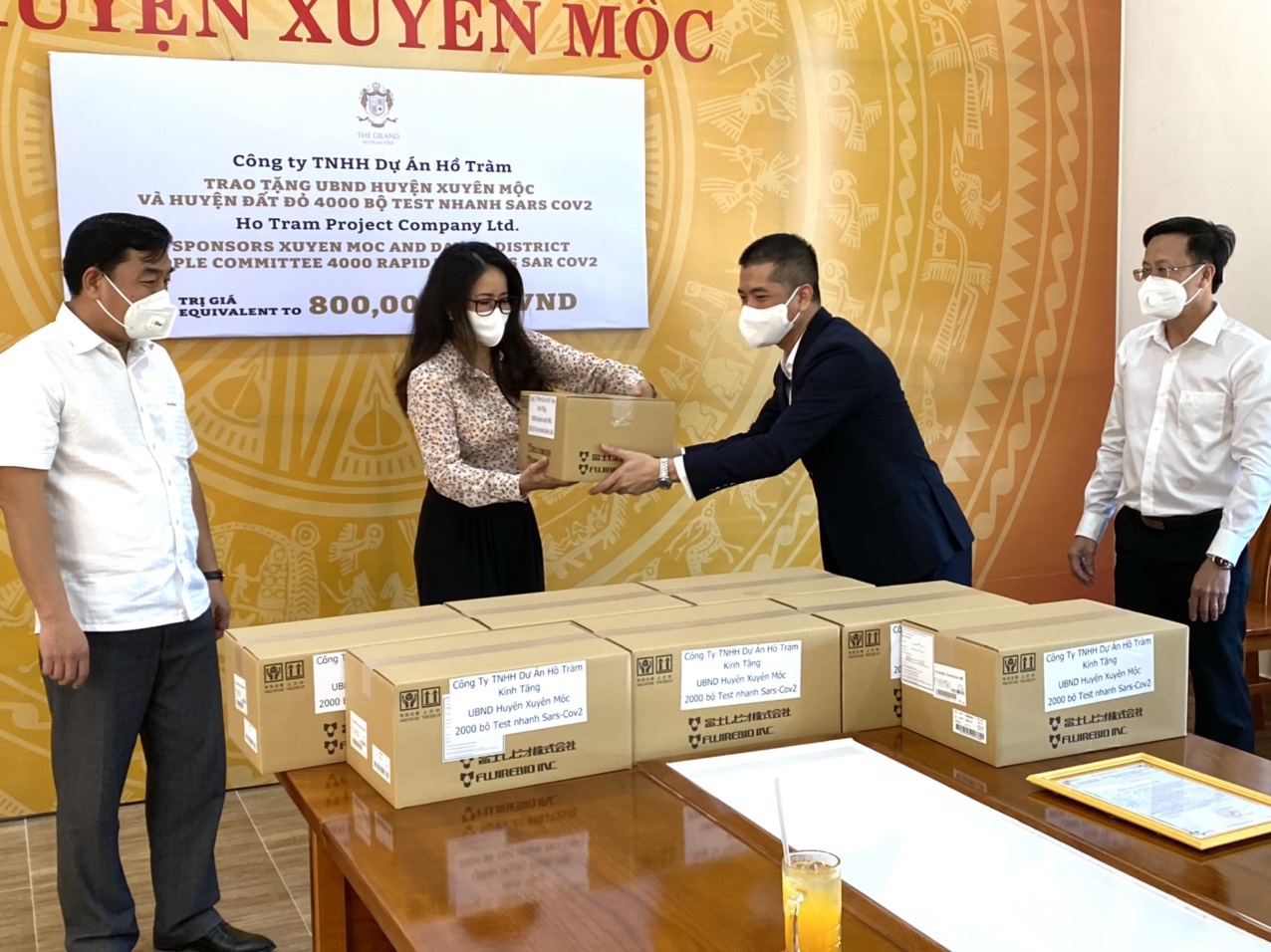 Khu phức hợp nghỉ dưỡng The Grand Ho Tram Strip mới đây đã trao tặng UBND huyện Xuyên Mộc và Đất Đỏ (Bà Rịa Vũng Tàu) 4.000 bộ kit test nhanh kháng nguyên Covid-19.
