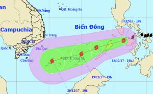 Đến 19h tối nay, vị trí tâm bão ở vào khoảng 10,3 độ Vĩ Bắc; 117,3 độ Kinh Đông, cách đảo Song Tử Tây (thuộc quần đảo Trường Sa) khoảng 340km về phía Đông Đông Nam. Sức gió mạnh nhất ở vùng gần tâm bão mạnh cấp 8 (60-75km/giờ), giật cấp 10.