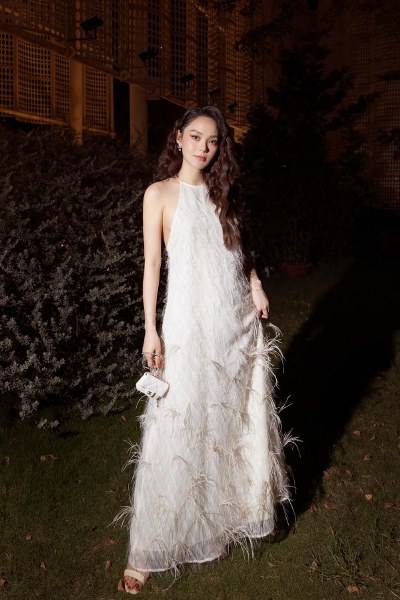 Cũng trong tháng này, tại một sự kiện khác, cô chọn đầm cổ yếm đính lông vũ cùng túi Chanel.