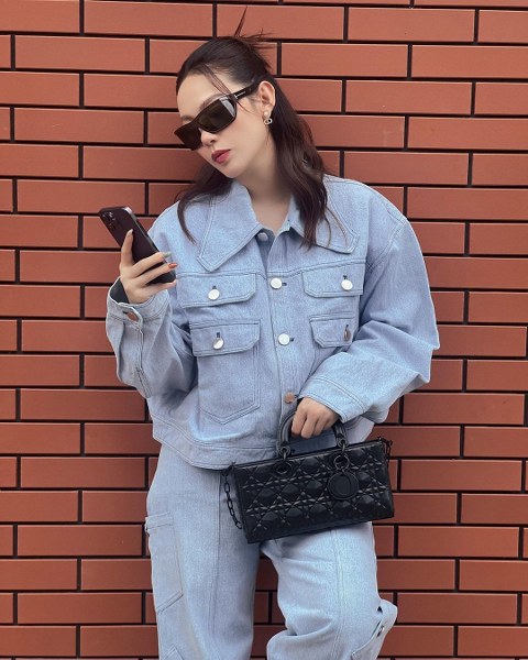 Minh Hằng cho biết cô hạn chế đi giày cao gót, ưu tiên giày dép bệt để tránh áp lực cho lưng và chân. Nếu có gót, cô chuyển sang gót thấp 3-5 cm hoặc giày đế xuồng. Diễn viên quan niệm bầu vẫn phải ăn mặc đẹp, trang điểm xinh xắn để tinh thần phấn chấn hơn, nên cô vẫn phối đồ tươm tất mỗi lần ra phố. Người đẹp theo đuổi cách phối denim on denim với túi Dior hơn 130 triệu đồng cùng khuyên tai của nhà mốt Pháp.