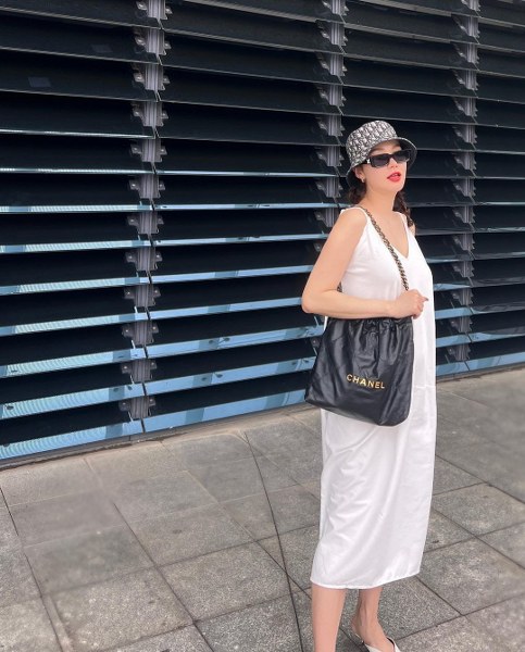 Cô dạo phố với váy lụa, túi Chanel 22 hơn 130 triệu đồng, mũ Dior và dép sục.