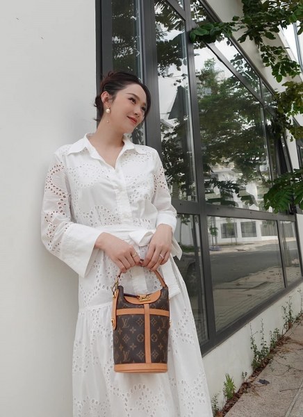 Đầm cotton đục lỗ được người đẹp tạo điểm nhấn bằng túi bucket của Louis Vuitton.