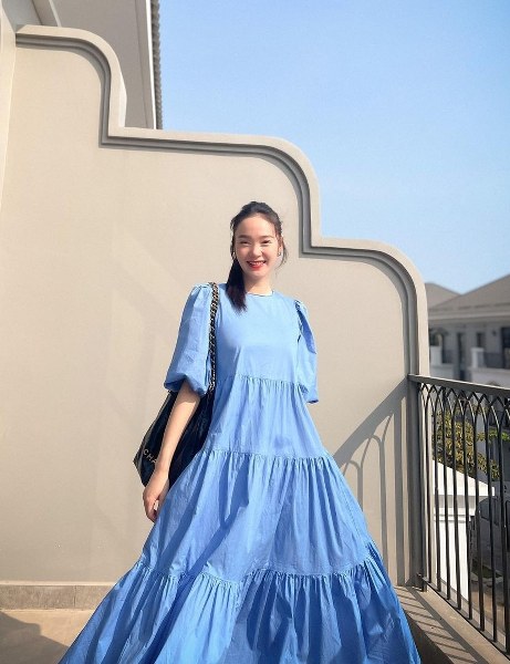 Khi đi sự kiện, Minh Hằng cũng chọn đầm chữ A hoặc suông để tạo thoải mái thay vì những thiết kế cut-out, bó sát như trước.