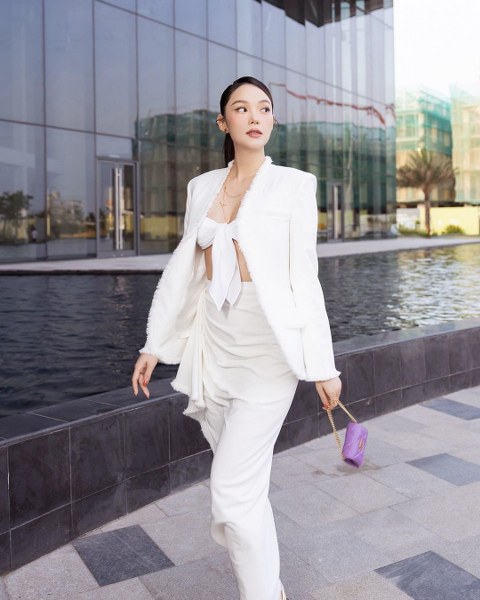 Khi đi xem show Lê Thanh Hòa hồi cuối tháng 3, cô diện cả "cây" trắng gồm bra top đồng điệu chân váy sarong, nhấn bằng túi mini Chanel tím.