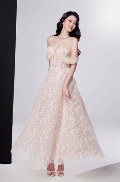Đầm voan cúp ngực, trễ vai được Khánh Linh yêu thích.