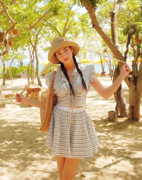 Họa tiết kẻ - một trong những xu hướng hot của Xuân Hè 2025 - được Lương Thùy Linh lựa chọn khi đi nghỉ dưỡng. Hoa hậu dùng mũ Loewe và túi Saint Laurent giúp tăng vẻ sang trọng.