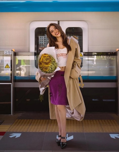 Như nhiều bạn trẻ, các sao Việt không chỉ trải nghiệm tàu điện mà còn tận dụng sân ga làm nơi chụp hình thời trang. Vừa qua, Ninh Dương Lan Ngọc chia sẻ bộ ảnh dạo chơi ở đây. Cô diện crop top và chân váy midi, kết hợp trench coat thể hiện nét thanh lịch.