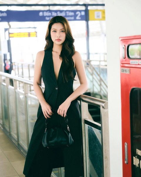 Hoa hậu Thiên Ân diện cả "cây" đen với gilet kẻ sọc dáng dài, đi kèm quần đồng điệu và túi xách.