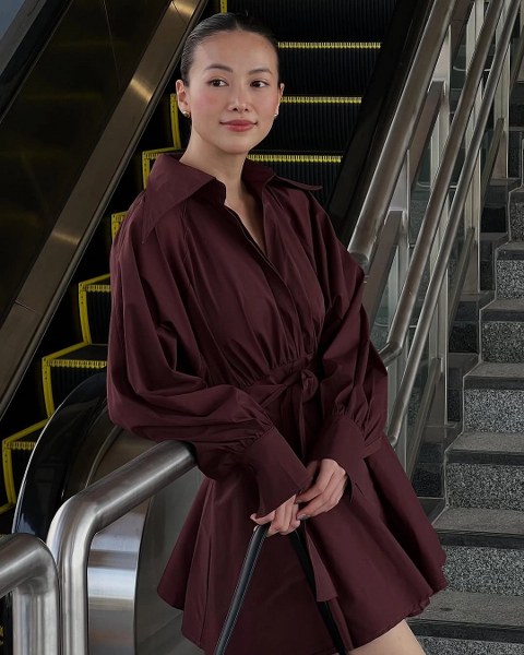 Hoa hậu Phương Khánh chọn váy sơ mi màu đỏ rượu - xu hướng hot năm ngoái.