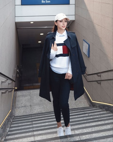 Tiểu Vy diện phong cách sporty chic với áo dệt kim của Tommy Hilfiger.