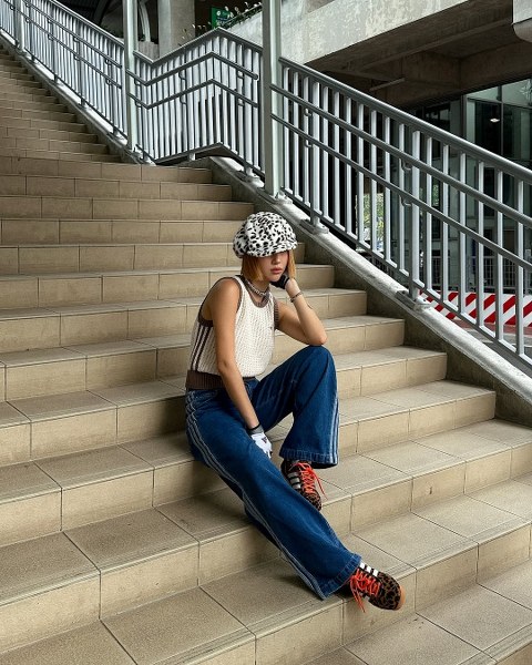 Fashionista Quỳnh Anh Shyn cũng chọn phong cách này với tank top, quần jeans và sneakers họa tiết da báo - mốt hot năm nay.