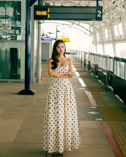 Phạm Quỳnh Anh hóa quý cô hoài cổ của thập niên 1950 với đầm chấm bi.