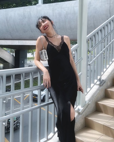 Tóc Tiên diện mốt váy ngủ với đầm lụa đắp ren và vòng choker Chanel.