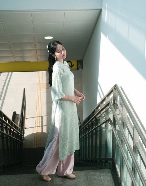 Á hậu Phương Anh tạo dáng trong tà áo dài cách tân màu pastel.