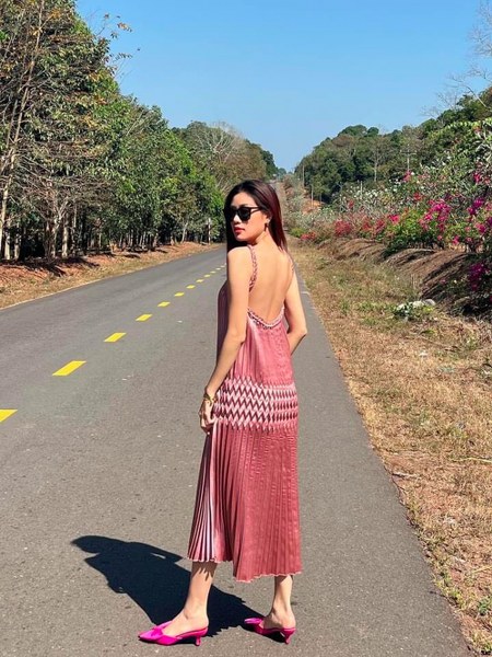 Hoa hậu Khánh Vân khoe trọn lưng trần với váy hai dây khi tạm xa Sài Gòn để tận hưởng không khí trong lành ngày đầu năm mới ở miền đồi núi.