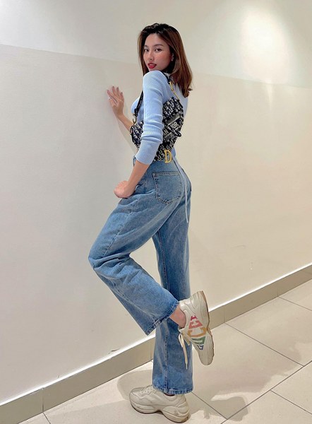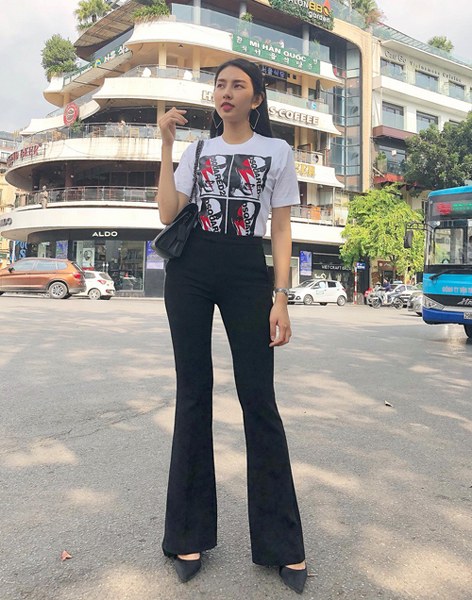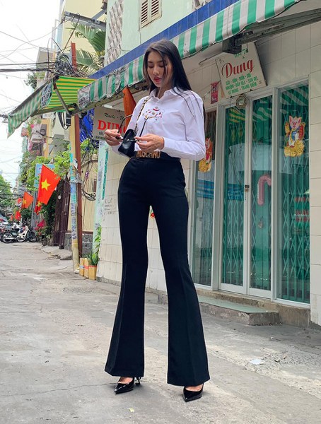 Những thiết kế ống loe phối giày cao gót giúp Thùy Tiên ‘hack’ dáng cho chân thêm dài, vóc dáng càng thanh thoát. Kiểu mix đồ này cũng phù hợp nhiều hoàn cảnh, từ dạo phố đến đi học, đi làm.