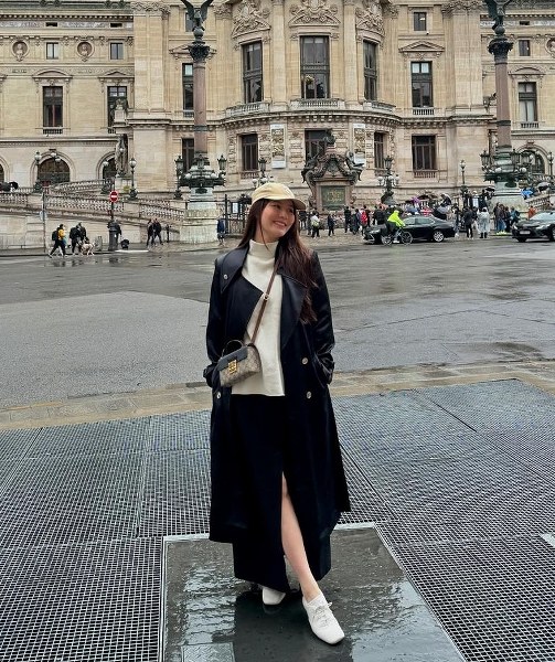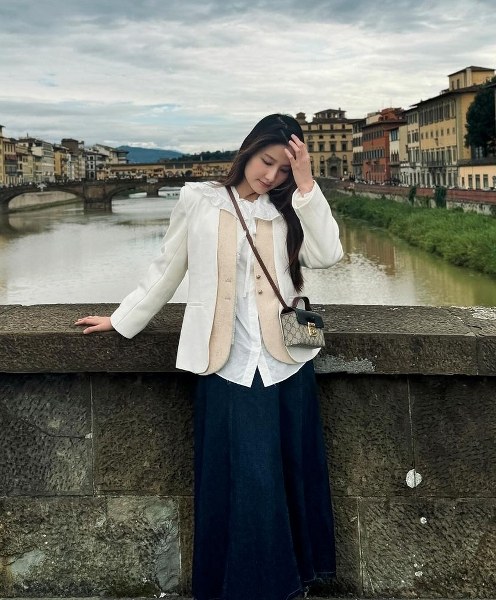 Người đẹp 34 tuổi vừa cùng chồng du lịch ở châu Âu, qua nhiều thành phố của Pháp và Italy. Cô chọn cách phối nhiều lớp với các thiết kế dáng rộng, nhằm tạo sự thoải mái khi di chuyển nhiều trong thời tiết se lạnh của mùa thu. Khi đi chơi trên cầu Ponte alla Carraia ở Florence, Diễm My diện chân váy denim kết hợp sơ mi, gilet, blazer và túi Gucci.