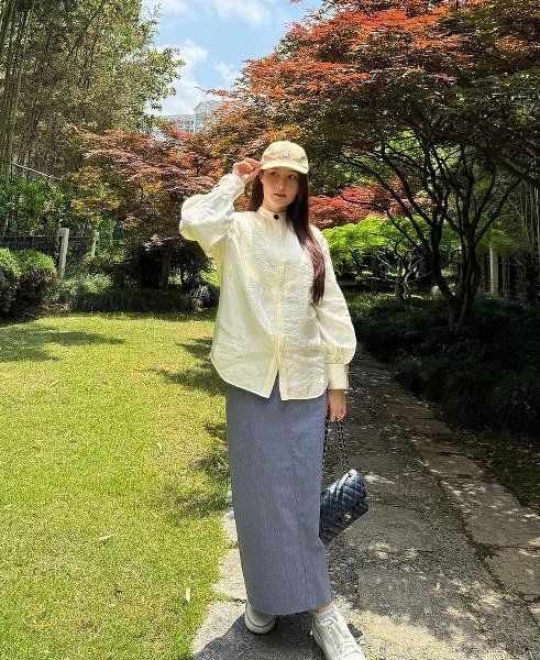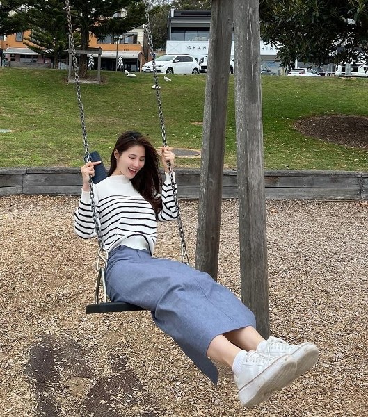 Trong chuyến đi chơi ở Tô Châu tháng 4, cô tạo điểm nhấn sang trọng bằng túi Chanel khi diện chân váy midi chữ A bằng denim.