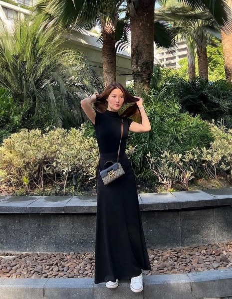 Diễn viên Diễm My 9X thường mang giày bệt và váy áo suông rộng trong các chuyến đi chơi.