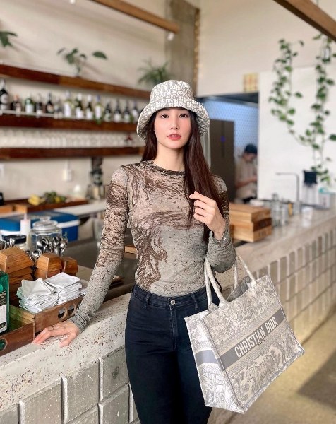 Người đẹp gây ấn tượng với cách phối ăn ý về gam màu, họa tiết trên trang phục và túi xách của Dior.