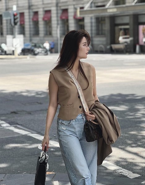 Trên đường phố Sydney, cô chọn phong cách urban chic với blazer, quần jeans và túi đeo chéo Louis Vuitton.