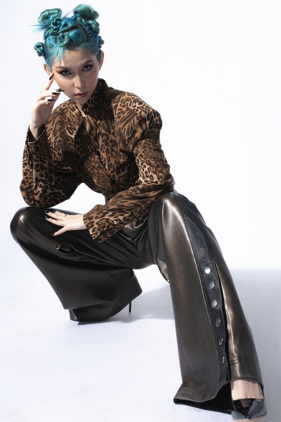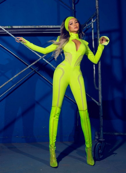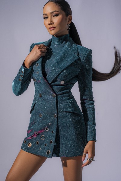 Hoa hậu H\'Hen Niê mặc trang phục màu chóe khi ghi hình \'The Next Face Vietnam\' cùng Lương Thùy Linh và Thùy Dương.
