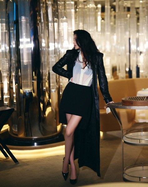 Cùng sự kiện, cô thay trang phục khác, kết hợp áo xuyên thấu với áo choàng da.