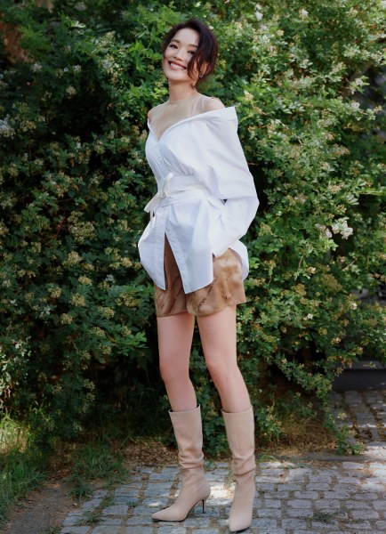 Thư Kỳ phối áo cách điệu với quần short nâu. Theo Vogue, nâu là một trong các màu hot nhất Thu Đông 2024, được các hãng thời trang quốc tế lăng xê. Nâu đi kèm trắng là sự kết hợp kinh điển, sang trọng và không nhàm chán.