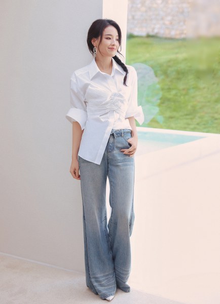 Trong đời thường, Thư Kỳ cũng thích mặc quần jeans, sơ mi hoặc các trang phục vải mềm, phóng khoáng, thuận tiện dịch chuyển.