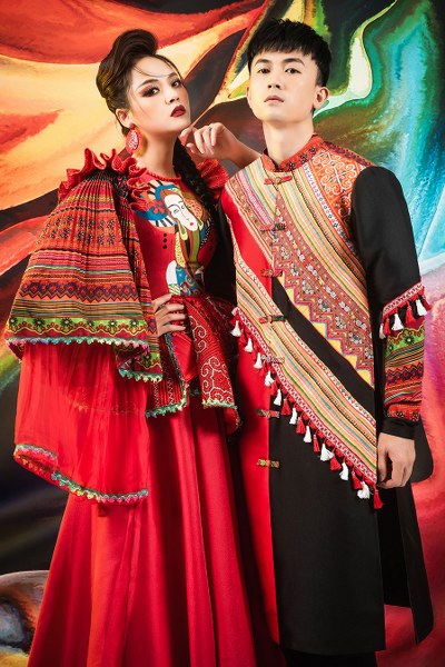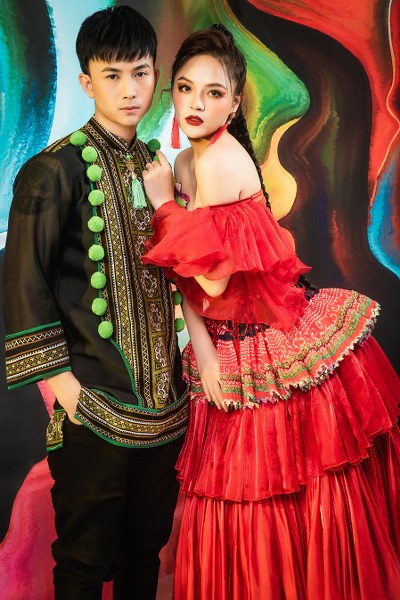 Diễn viên Thu Quỳnh, Hoàng Anh Vũ cùng diện trang phục thổ cẩm trong bộ sưu tập \'Hồn Tây Bắc\' của nhà thiết kế Thạch Linh.