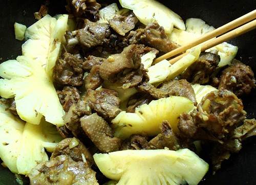 Cho dứa vào xào đến khi dứa tiết ra vị chua.