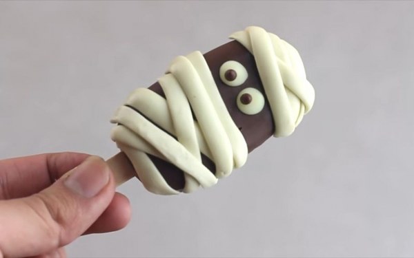 Sau khi kem đông, cho 50ml socola trắng đã đun chảy vào túi bắt kem và bắt đầu tạo hình xác ướp cho que kem. Đặt vào ngăn đông tủ lạnh khoảng 30 phút cho phần socola đông lại là có thể thưởng thức được ngay.