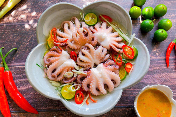 Bạch tuộc ngâm sả tắc giòn dai, đậm đà gia vị, làm món ăn cùng cơm hay món ăn chơi chơi đều hợp.